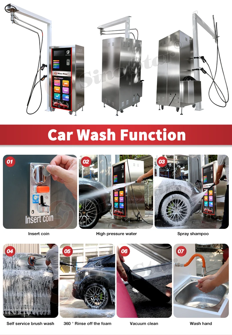 The SCW-109 is the latest version of our self service car wash machine series, developed by Sino Star as a new generation to meet customers needs for convenient fleet management (managing a large number of devices). lts main feature is the ability to integrate and manage all devices through a single management interface, while also achieving true unattended operation (besides enabling self-service car washing, payments can be directly processed through the device without manual assistance).lt stands as a representative of highly functional small self-service car wash equipment in the current market, truly a terminal-grade device with a multitude of features.